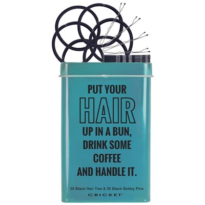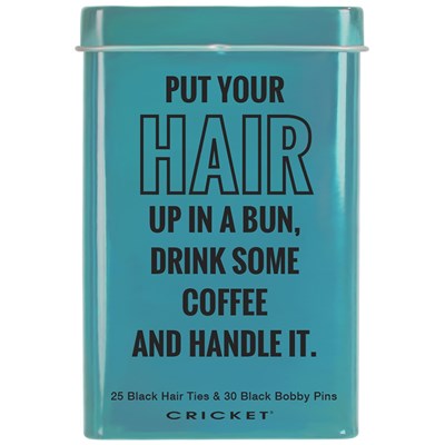 Compact size tin stores 25 black hair ties and 30 black bobby pins for easy access – never dig through a purse or gym bag again!