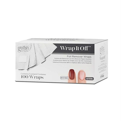 Gelish® Wrap It Off Foil Wrap Removal System is a simple, easy & quick gel polish removal at your fingertips. Sturdy pieces of high-quality foil with a cotton pad adhered to the foil makes taking off gel polish quick and effortless. Lightly buff surface of gel polish and saturate a Gelish® Wrap It Off Foil Wrap with Gelish® Artificial Nail remover; wrap around each nail to soak for 10-15 minutes to remove gel polish. Lightly buff natural nail bed to remove any remaining gel.